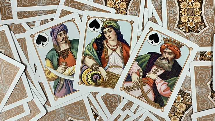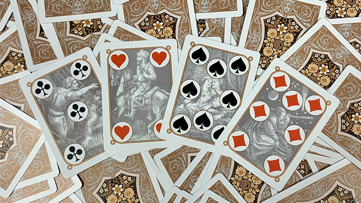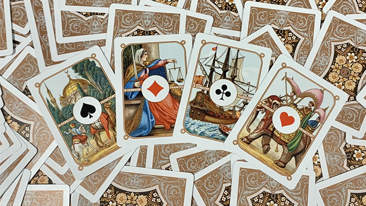 A reproduction of B. Dondorf's No. 207 deck from the year 1870 depicting the "Four Corners" of the world; Europe, Asia, Africa and America. Unique art on every single card! Information cards are included to indicate the royalty featured on the court cards and the scenes depicted on the number cards. The back, joker, box and tuck seal were all inspired by original Dondorf designs giving the deck an authentic look.
