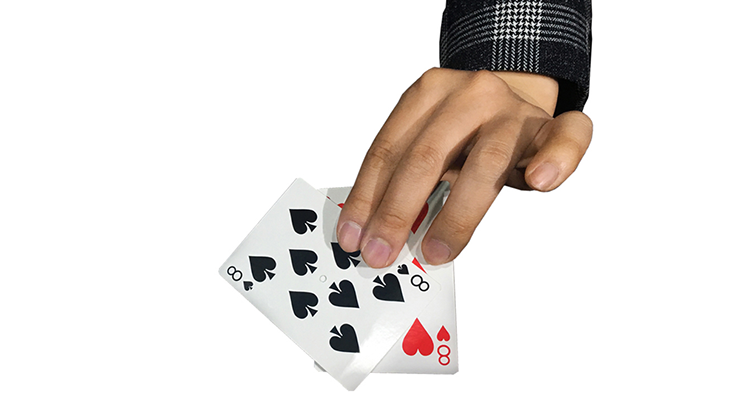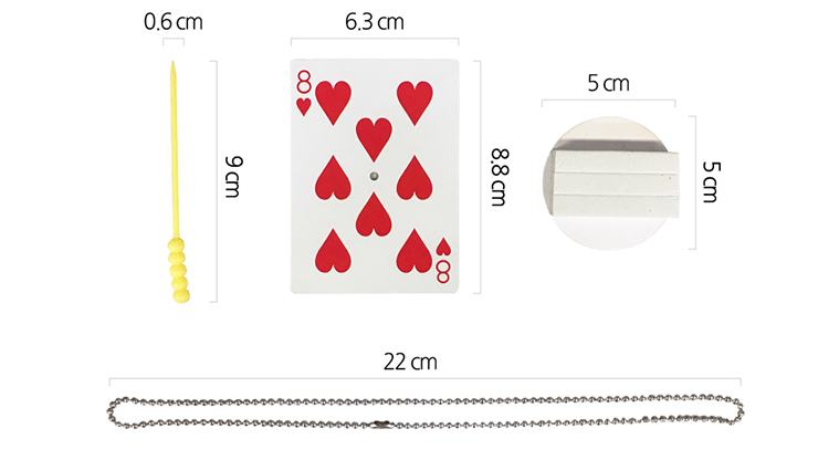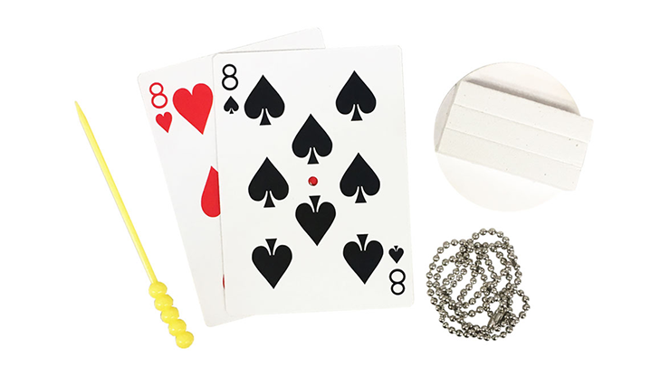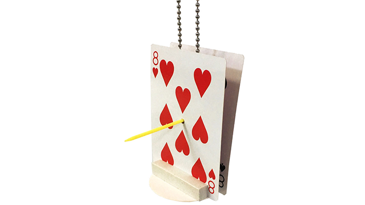 Two cards, each with a hole in the center, are placed on a stand. The magician inserts a chain between the two cards and rests on the table. A plastic sword then goes through both cards and remains in place. To prove that the sword is solid and is impaling the cards, the chain is raised and lifts both cards in the air. NOW for the magic! The magician pulls the chain, and it appears to penetrate right through the sword!