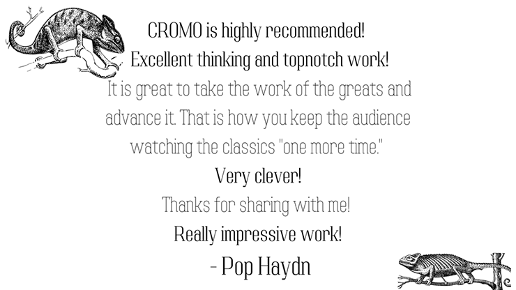 "CROMO is highly recommended! Very clever! Excellent thinking and topnotch work! It is great to take the work of the greats and advance it. That is how you keep the audience watching the classics "one more time." Thanks for sharing with me! Really impressive work!"