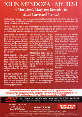 John Mendoza is a legendary figure in close-up magic and his books and manuscripts can be found in just about every magician's library. In addition to his own effects and routines, John has also authored books for such notables as Don England, Chris Kenner and Dan Fleshman. For over 35 years, he's made his living performing close-up magic and in this remarkable set of DVDs, John shares the secrets of that success. These are the tricks that have taken John Mendoza literally around the world - they're the very best effects that this world-class entertainer has to offer - and now they can be yours.