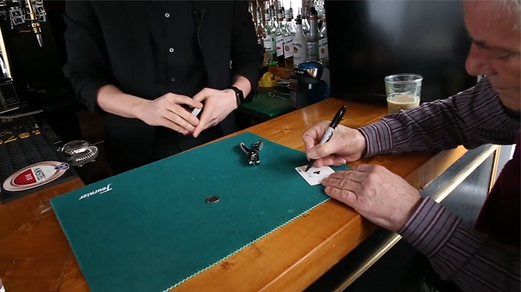 A card is selected and signed (any card, no force required). The magician then punches a hole in the card. Handing the card and a borrowed coin to your spectator, a challenge or puzzle is set. Can they get the coin through the hole without damaging the card?