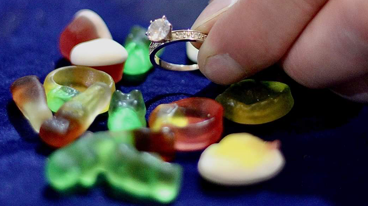 The magician rips open the bag and pours the contents out of the bag into the hands of the spectator. Their ring lands in their hands, and they also get to eat the sweets! Everything is examinable. Harribo is super fun for all ages, is very easy to perform and gets the sweetest reactions.