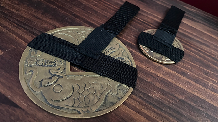 Two elastic coin loaders. These can hold and steal a stack of coins or one at a time. Comes with two sizes for a variety of jumbo coin use.