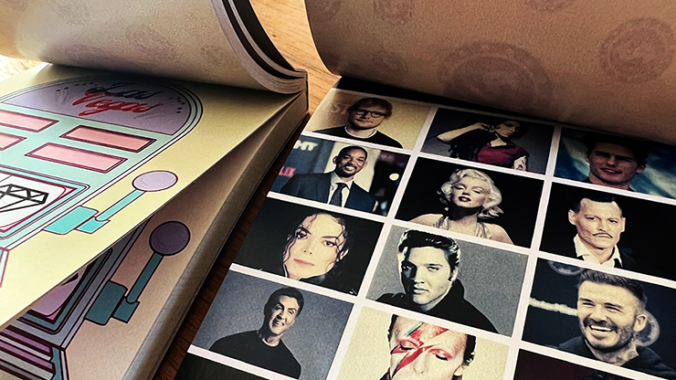 Con-FabFlick through the book and show a plethora of different Las Vegas hotel talked about on each individual page - they really are all different! Get your spectator to lift up any random page and remember the hotel... not just the hotel but a playing card, a dice value or maybe even a roulette number, all displayed in the page graphics. You are then able to predict or reveal all the information before going one step further and revealing a word on the page!