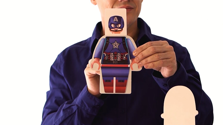A Lego figure is shown, with its torso and legs but without the head. The spectator picks between different character images of their heads. The magician says he knew which head they will pick, showing the back matches the character. As a great finale, with a little hit in the card, the figure explodes and the full character image appears.