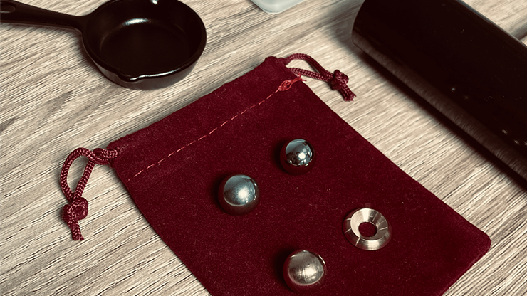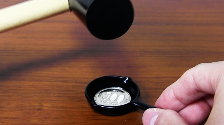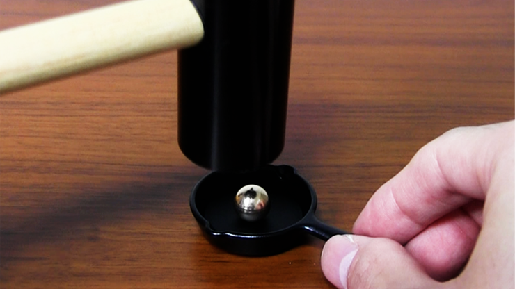 Places a metal ball on a miniature skillet. After heating the metal ball with a lighter, hits it with a