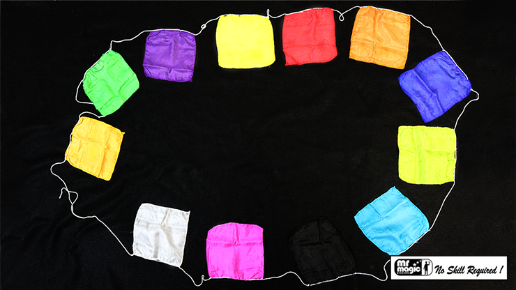 Generations have seen the endless string of silks being pulled from a pocket or other prop -- it is always a delight to audiences young and old. Twelve different-colored 6" silks are tied together and open flat as you pull them in what seems to be a never-ending gag.