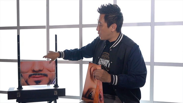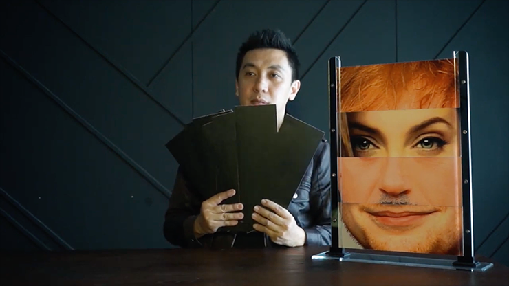EFFECT:3 celebrity photos each cut into 4 parts: forehead, eyes, nose and mouth. So there are 3 sets of foreheads, 3 sets of eyes, 3 sets of noses, and 3 sets of mouths. The spectator then randomly chooses a part of the face from each set. There is less than a 2 percent chance that it will be a correct set. The result, of course a messy-mixed set that looks funny. But what they don't know, that the messed up face have a secret image behind it, which compose a whole new complete face, whilst the rest of the unselected parts are blank on the back.