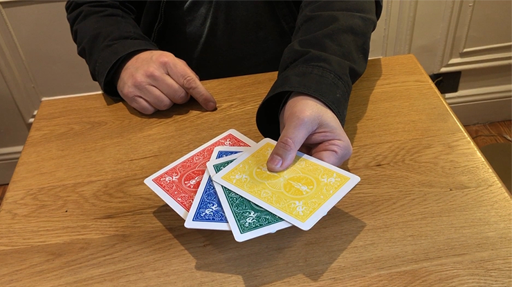 A three-phase routine with a kicker ending: The magician starts with three blank cards and one Ace. The cards also have different colors on the backs so they are easier to follow. Even being this fair, no one can guess where the Ace is!