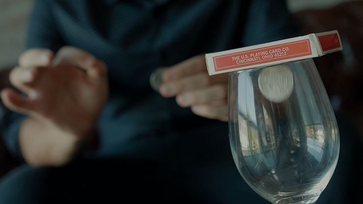 Coins will vanish from magician hands and will appear one at the time in a glass that is covered by the deck of cards!
