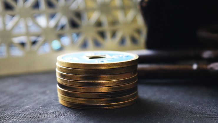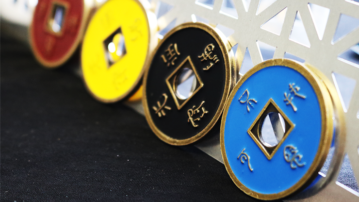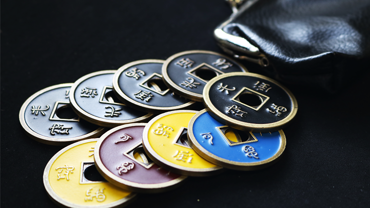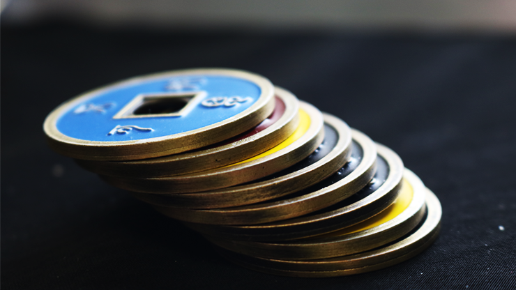 This is a beautiful set of Chinese coins in one-dollar size. It includes 9 different coins: one expanded steel shell, 4 blacks coins, one red coin, one blue coin, one yellow coin, one double-side yellow and blue coin, and one special purse. Marcel, a close-up expert Argentinean magician, created many amazing routines with this set. These are included in the video instructions.