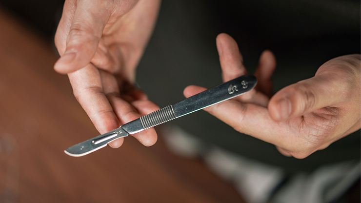 - A scalpel holder that allows for the quick assembly and removal of blades with one's bare hands, making it more ritualistic and safer for the audience to examine the blades, and more visible during stage performances.