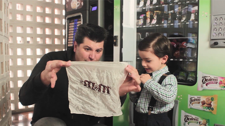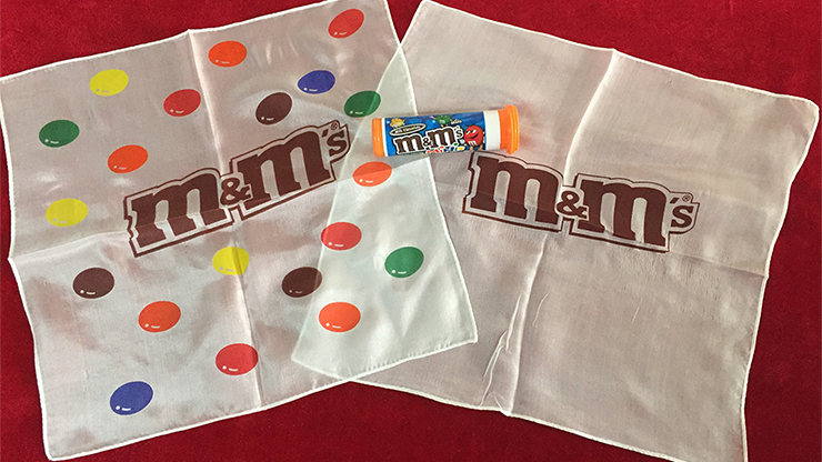 The magician shows an M&M's tube, and shakes it to prove it is empty. He opens the tube and removes, from the inside, a special white silk with the M&M's logo and some M&M's printed on it. He shows the tube is empty, he closes it and gives it to a spectator to hold. The silk is now tucked into the magician's fist and then is vanished in midair! The spectator is asked to open the tube and to his amazement, the handkerchief is found back in the tube again!