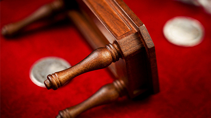 The EffectYou show a small ornate wooden table that can be handed out for examination. You then introduce 4 half dollars and one by one cause the coins to visibly penetrate the table with no cover. At the end of the performance, you drape black silk over the table and with a gentle press cause the table to penetrate the working surface or vanish entirely.
